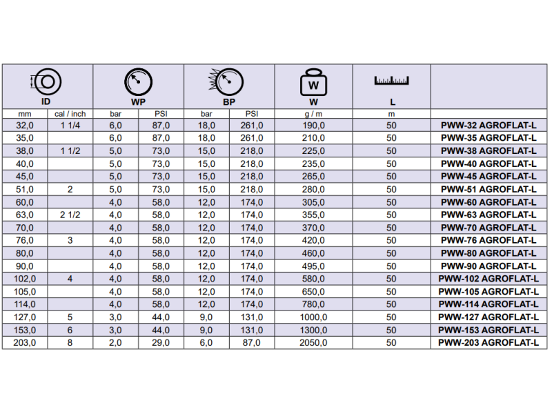 • Flachschlauch zur Beförderung von Wasser/Abwasser, leichte Chemikalien und verschiedene Flüssigkeiten, in Landwirtschaften und Industrien.