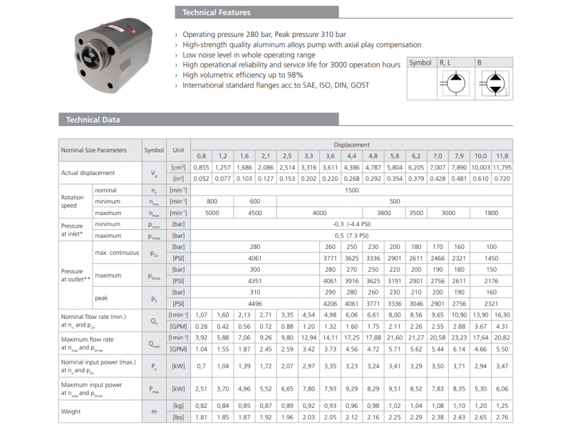 Pompa zębata z ciśnieniem szczytowym do 310 Bar o prędkości obrotowej do 5000 obr/min.