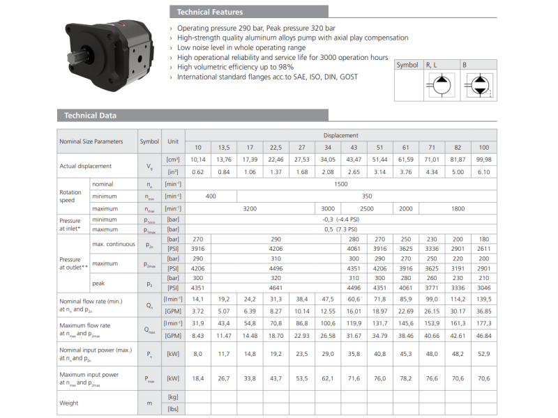 Pompa zębata z ciśnieniem szczytowym do 320 Bar o prędkości obrotowej do 3200 obr/min.