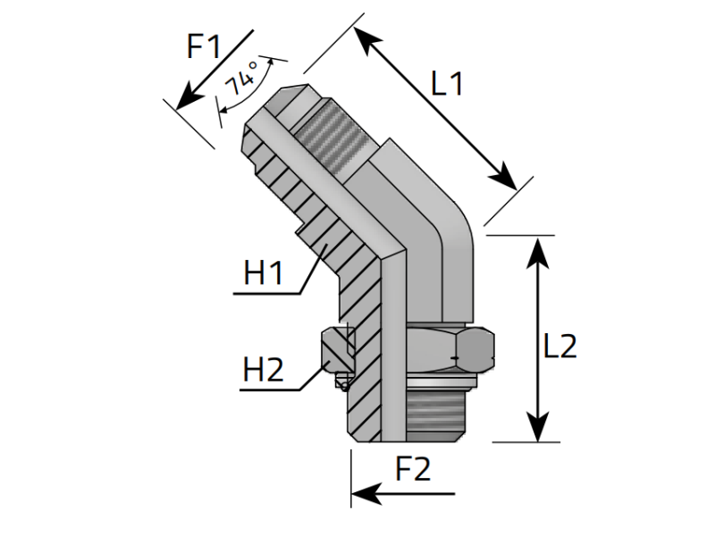 Kod produktu: HS-KAT-VEEM-JIC-M-CRV-9/16JIC-M14x1,5 ID: 2354294Przyłącze kątowe 45° z gwintem zewnętrznym calowym JIC ze stożkiem 74° na gwint zewnętrzny Metryczny w korpus, kontrowany nakrętką.