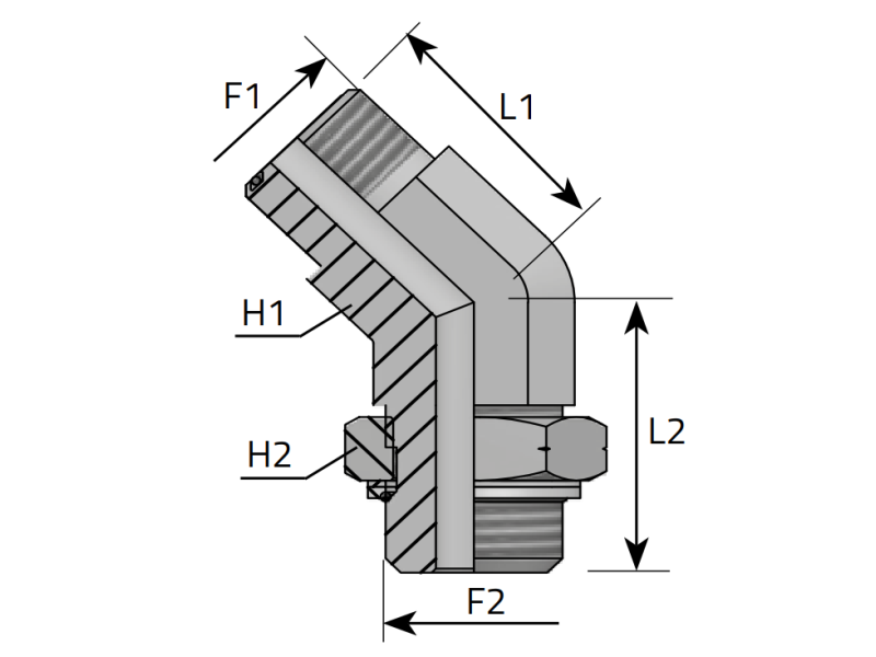 Kod produktu: HS-KAT-VEEM-ORFS-M-CRV-9/16ORFS-M10x1,0 ID: 2356554Przyłącze kątowe 45° z gwintem zewnętrznym calowym ORFS na gwint zewnętrzny Metryczny w korpus, kontrowany nakrętką.