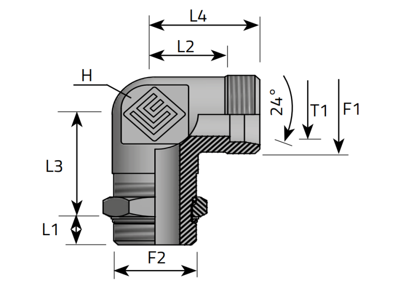 Kod produktu: HS-KAT-WEEM-M-M-CRV-12LM18x1,5-M16x1,5 ID: 2474336Przyłącze kątowe 90° z gwintem Metrycznym ze stożkiem 24° na gwint zewnętrzny Metryczny w korpus, kontrowany nakrętką.