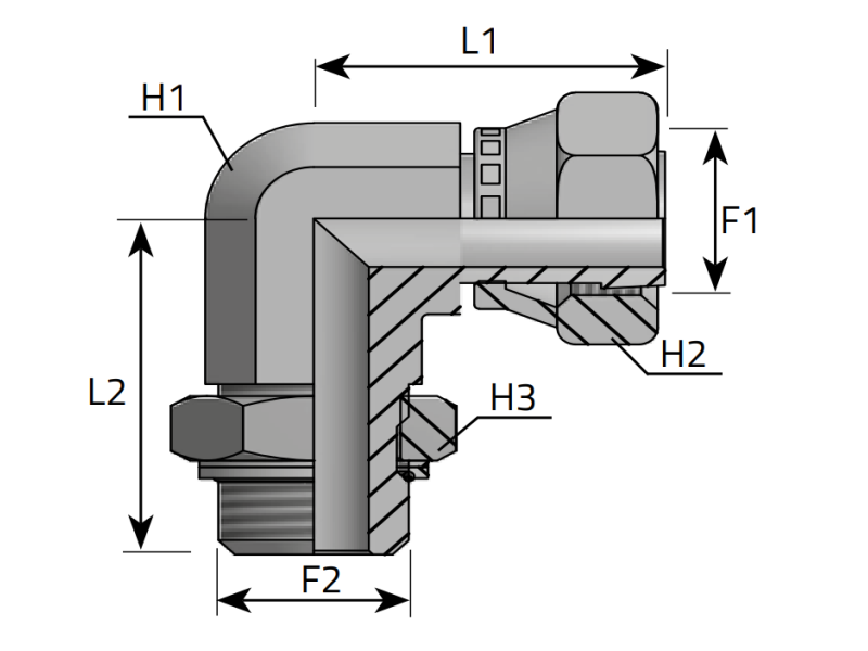 Kod produktu: HS-KAT-WWER-ORFS-BSPP-CRV-1.7/16ORFS-1BSPP ID: 2356917Przyłącze kątowe 90° z gwintem wewnętrznym calowym ORFS na gwint zewnętrzny calowy BSPP w korpus, kontrowany nakrętką.