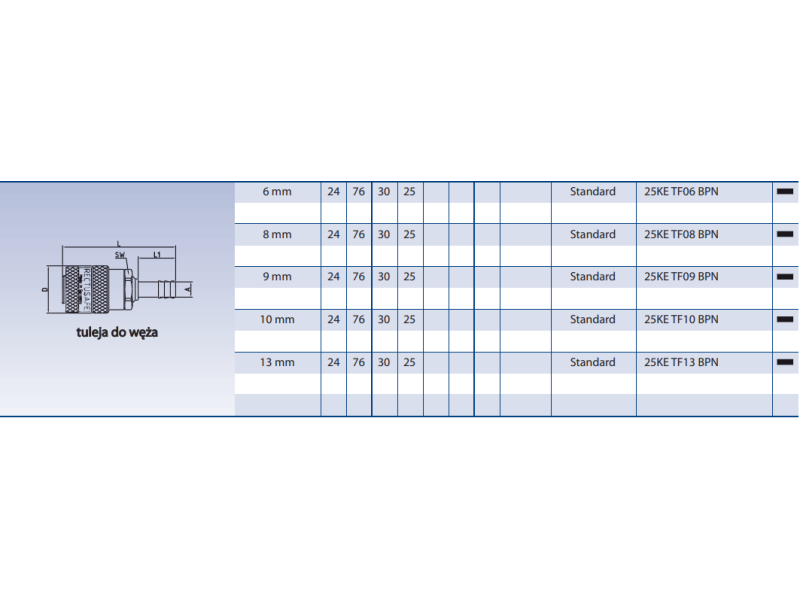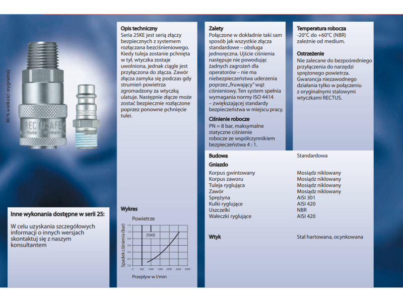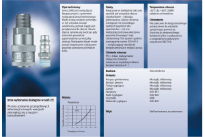 Kod produktu: 25KE ID: 1323Seria 25KE jest serią złączy bezpiecznych z systemem rozłączana bezciśnieniowego. Kiedy tuleja zostanie pchnięta w tył, wtyczka zostaje uwolniona, jednak ciągle jest przyłączona do złącza. Zawór złącza zamyka się podczas gdy strumień powietrza zgromadzony za wtyczką ulatuje. Następnie złącze może zostać bezpiecznie rozłączone poprzez ponowne pchnięcie tulei.