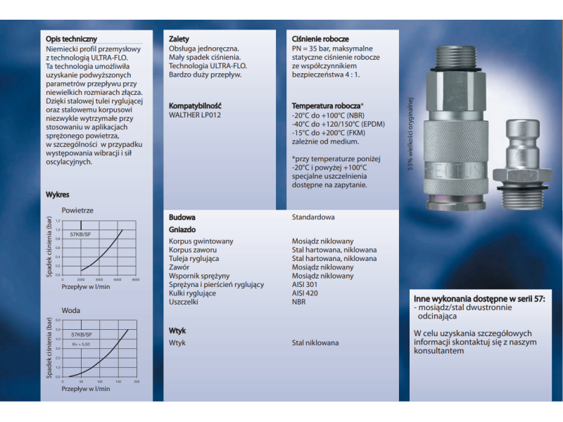 Kod produktu: 57KA ID: 1321Niemiecki profil przemysłowy z technologią ULTRA-FLO. Ta technologia umożliwiła uzyskanie podwyższonych parametrów przepływu przy niewielkich rozmiarach złącza. Dzięki stalowej tulei ryglującej oraz stalowemu korpusowi niezwykle wytrzymałe przy stosowaniu w aplikacjach sprężonego powietrza, w szczególności w przypadku występowania wibracji i sił oscylacyjnych.