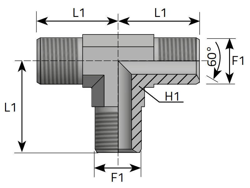 Trójnik MT stożek 60° M20x1,5, Materiał: Stal węglowa Cr(VI)-free/Zn-Ni, Rozmiar gwintu: M20x1,5