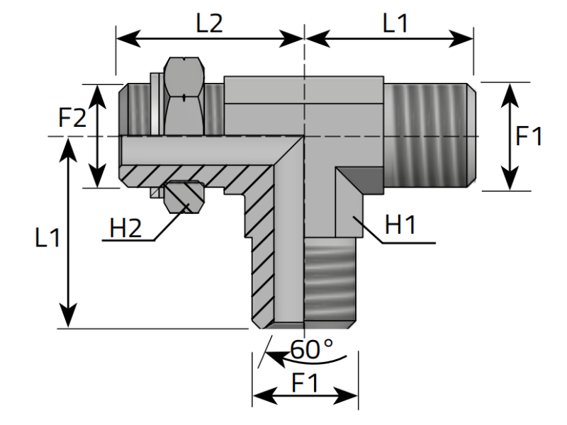 Trójnik niesymetryczny TEEL M stożek 60° M14x1,5 - M14x1,5, Materiał: Stal węglowa Cr(VI)-free/Zn-Ni, Rozmiar gwintu: M14x1,5 - M14x1,5