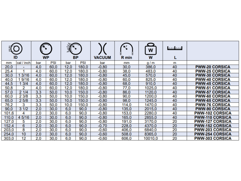 • Reinforcement: 2 high tensile synthetic textiles, steel wire helix.