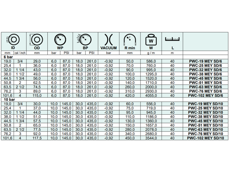 Wąż ssawno - tłoczny do przesyłu cieczy spożywczych MEY SD/6-10, Średnica DN: 19 mm - 3/4", Ciśnienie: 10 BAR