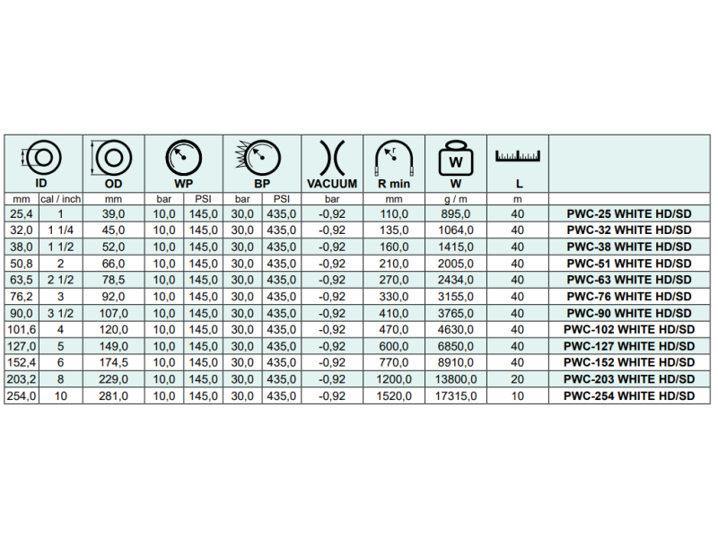 Wąż ssawno - tłoczny do przesyłu substancji spożywczych WHITE HD/SD, Średnica DN: 25 mm - 1"