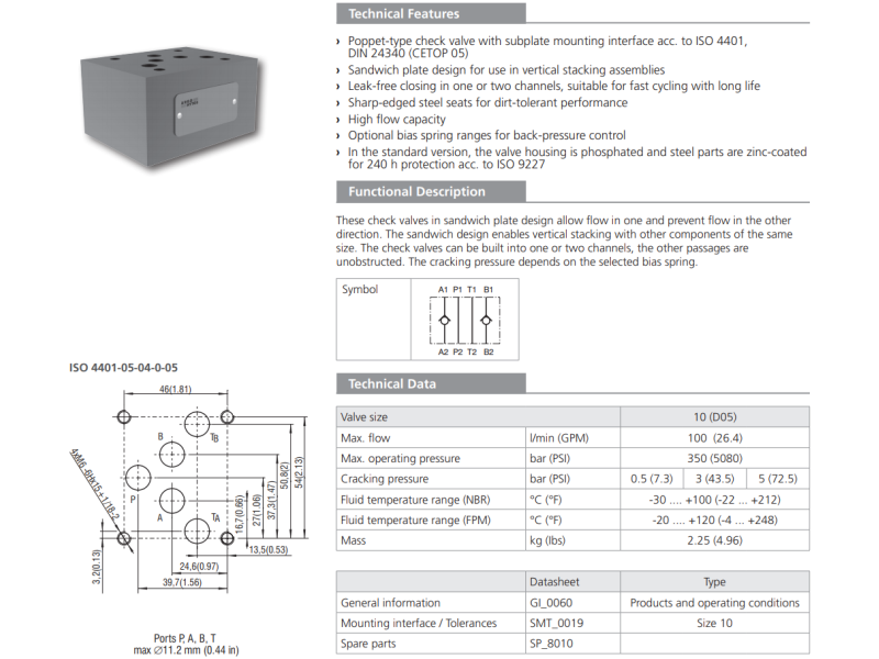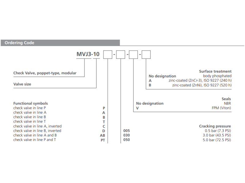 Zawór MVJ3-10, Surface treatment: No designation, Seals: No designation, Cracking pressure: 030, Functional symbols: P