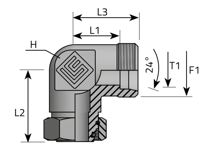 Kod produktu: HS-KAT-EW-M-CRV-06LLM10x1,0 ID: 2474231Złącze kątowe z nakrętką nastawną 90° z gwintem wewnętrznym Metrycznym i stożkiem 24° na gwint zewnętrzny Metryczny, również ze stożkiem 24°.